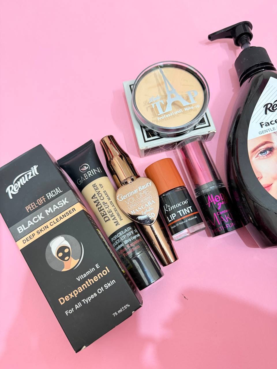ژل شستشوی صورت،ماسک زغال،پنکک،کرمپودر،کانتور،ریمل قهوه ای ،تینت
